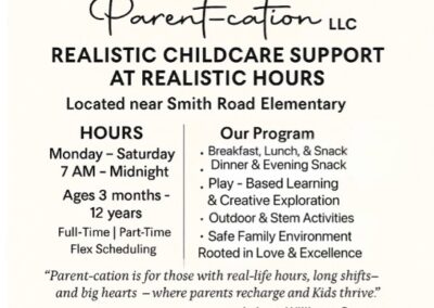 Parent‑cation LLC provides children with opportunities for discovery, play, social engagement, and hands‑on learning in a safe, family‑style environment. With flexible hours that support working families, the program incorporates elements like creative play, exploration, and outdoor time to help young learners grow in confidence and curiosity. As a licensed provider, Lakeva’s dedication reflects the goals of the ECCPP — strengthening childcare capacity in the community while empowering early childhood professionals.