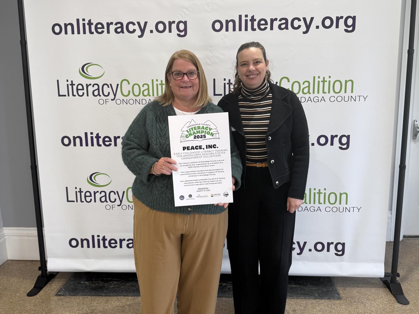A huge thank you to the Literacy Coalition of Onondaga County for awarding a $3,000 grant to PEACE, Inc.’s Foster Grandparent Program! With this generous support, AmeriCorps Seniors volunteering in Syracuse City Schools and Head Start/Early Head Start Classrooms will receive specialized early childhood literacy training — empowering them to make an even greater impact on young learners’ lives. This is but one wonderful example of our Seniors imparting wisdom while continuing their own lifelong learning. It’s a win for everyone involved!