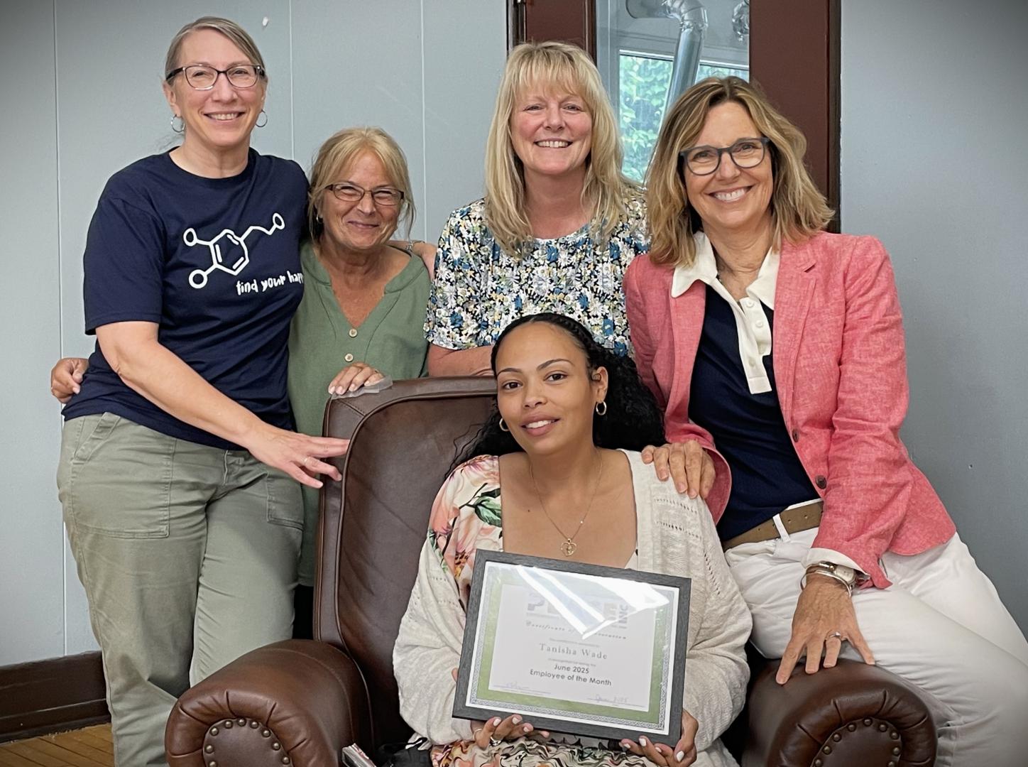 Photo: Employee of the Month Tanisha Wade (seated) with (L to R) HS/EHS Health Coordinator Tammi Hatch, RN Christina Lear, Merrick Site Supervisor Lynette Durkin, and Executive Director Carolyn Brown.